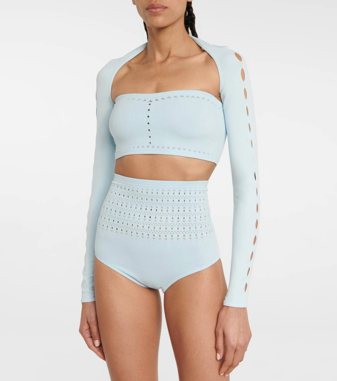 Alaïa vervollständigt unsere Sommerlooks mit diesem hellblauen Bolero auf die bestmögliche Weise. Er wurde aus elastischem Tech-Material gefertigt und mit den charakteristischen Vienne-Cut-outs an den Ärmeln sowie am Rücken akzentuiert.
