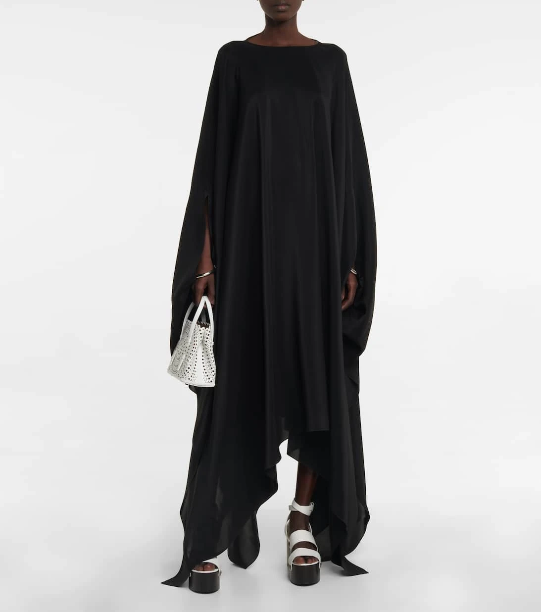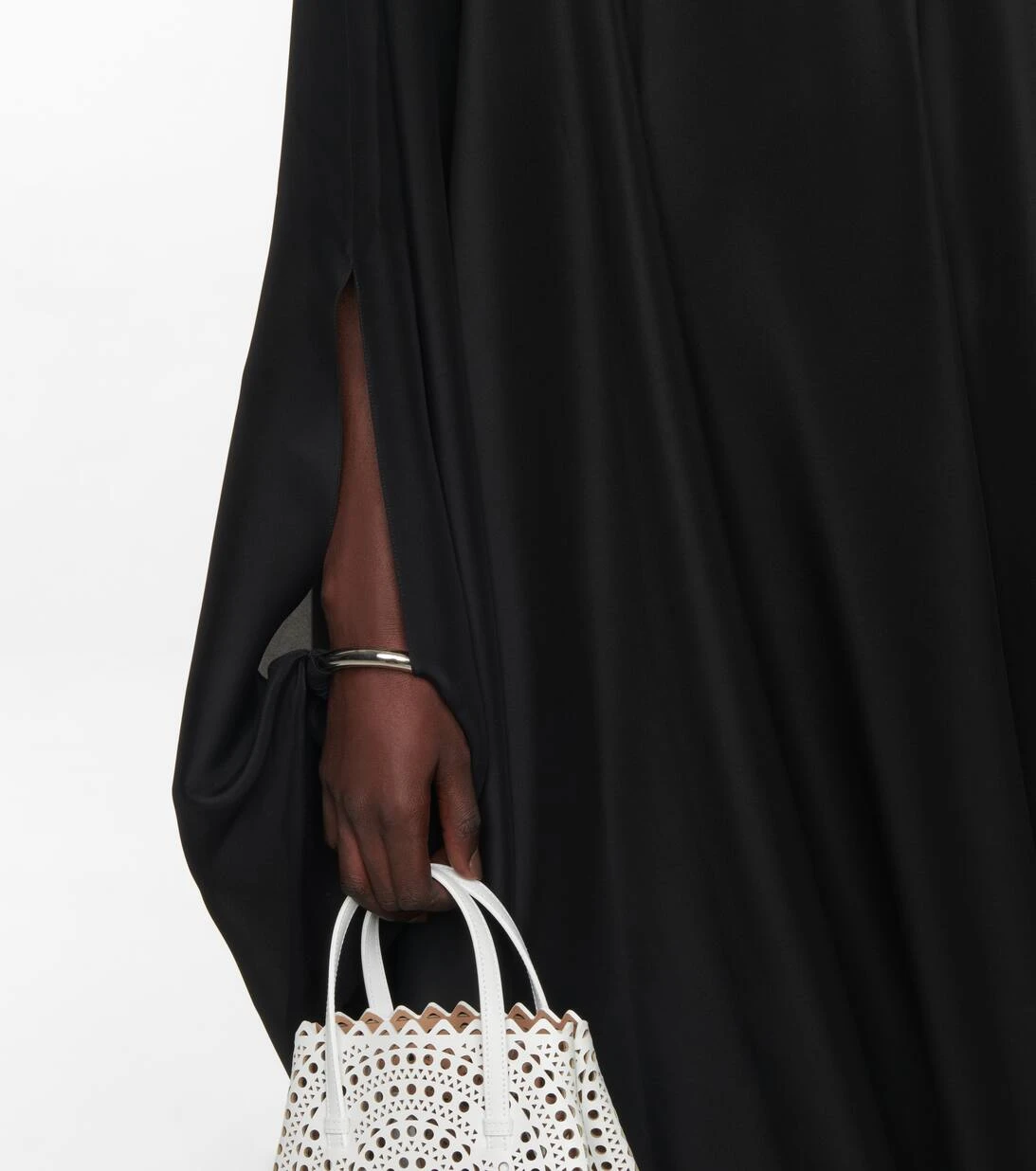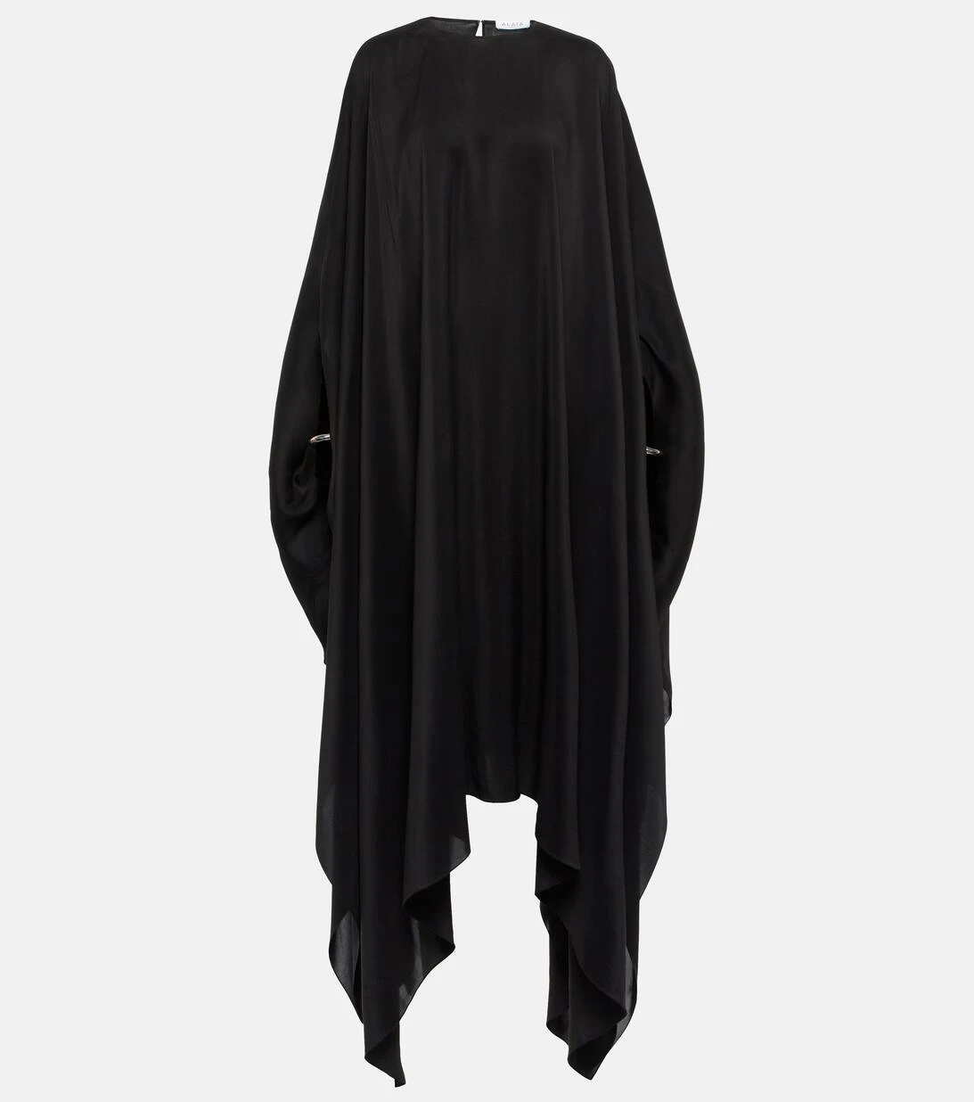 Dieser lange Kaftan von Alaïa aus glänzender Seiden-Georgette ist minimalistisch im Design, aber maximal elegant. Das Modell zeichnet sich durch eine fließende, asymmetrische Silhouette und silberfarbene Metallmanschetten aus.