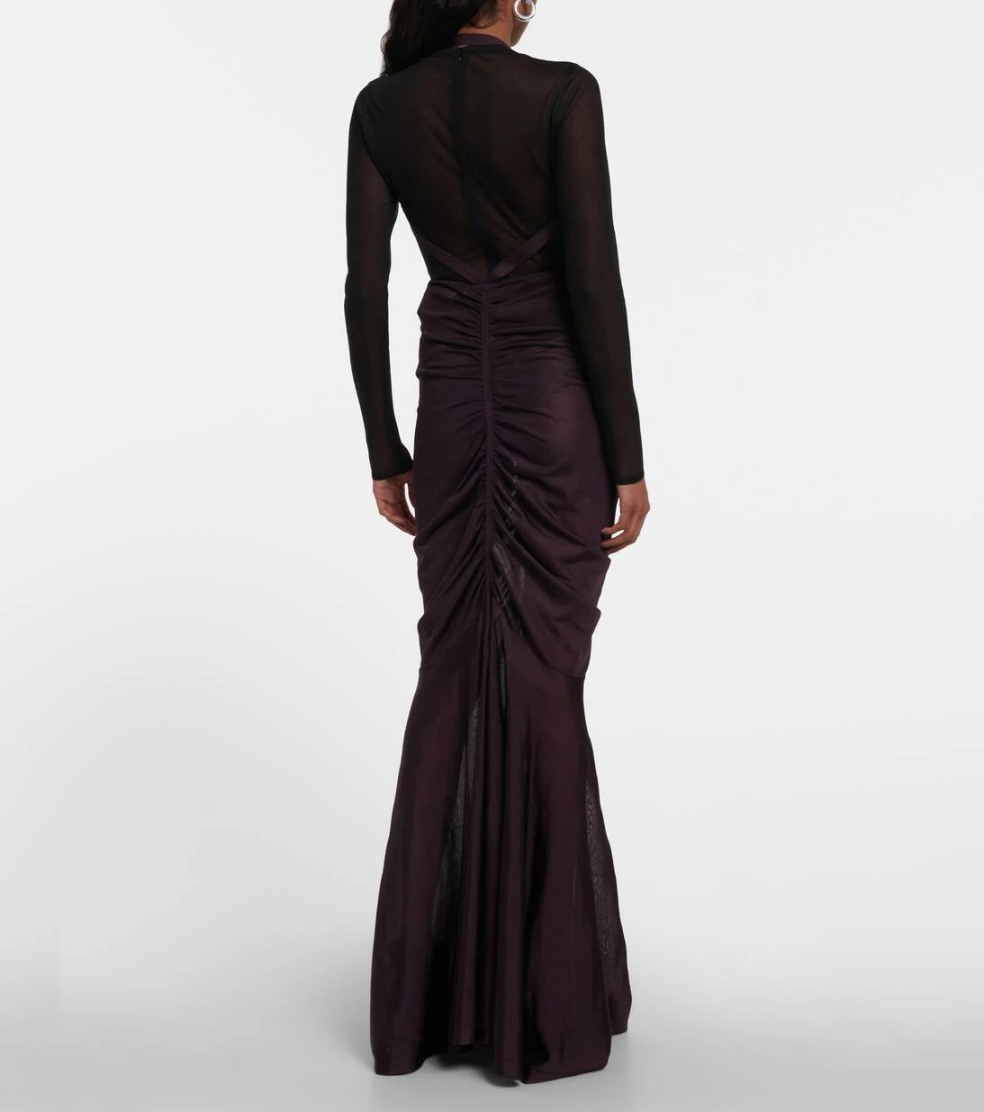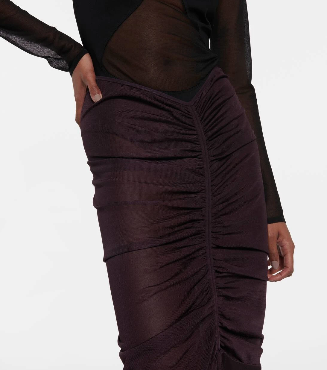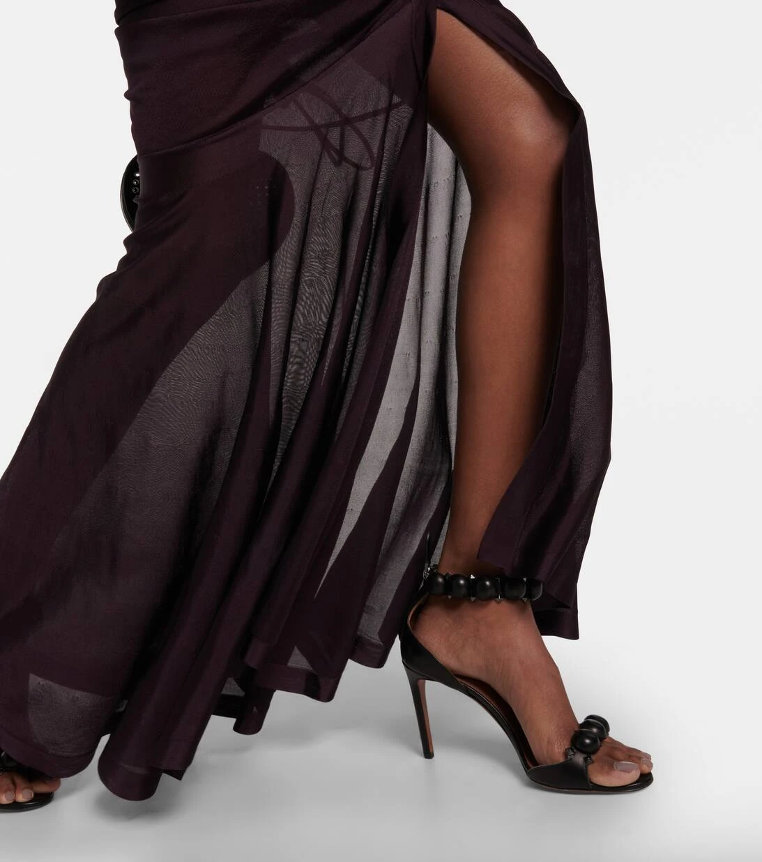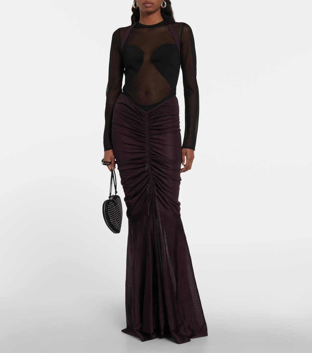 Der Harness Maxirock von Alaïa zeichnet sich durch eine drapierte Mitte aus, die in eine fließende, bodenlange Silhouette übergeht. Das Modell aus glänzendem Jersey verfügt über einen Riemen, der für einen perfekten Sitz sorgt.