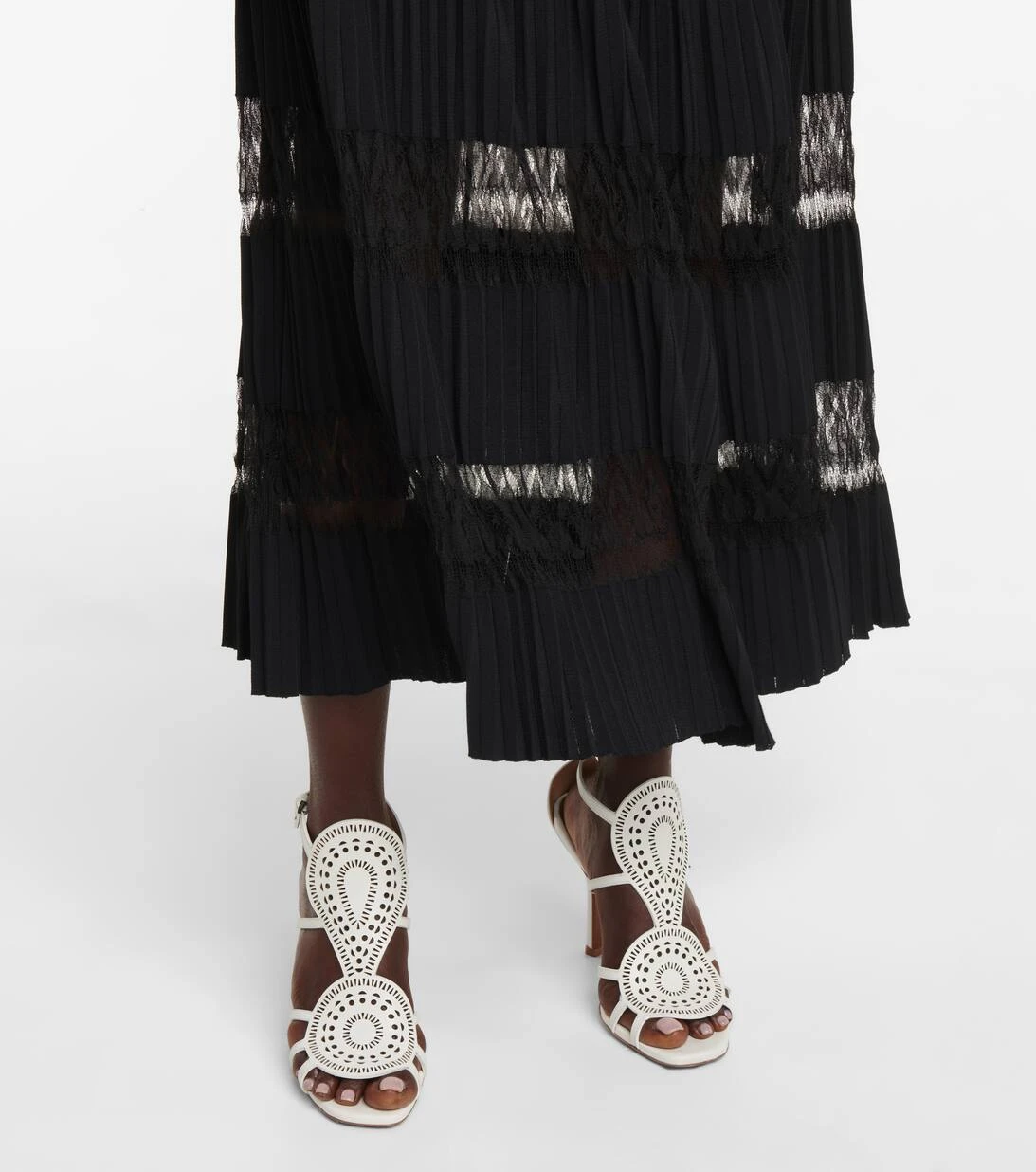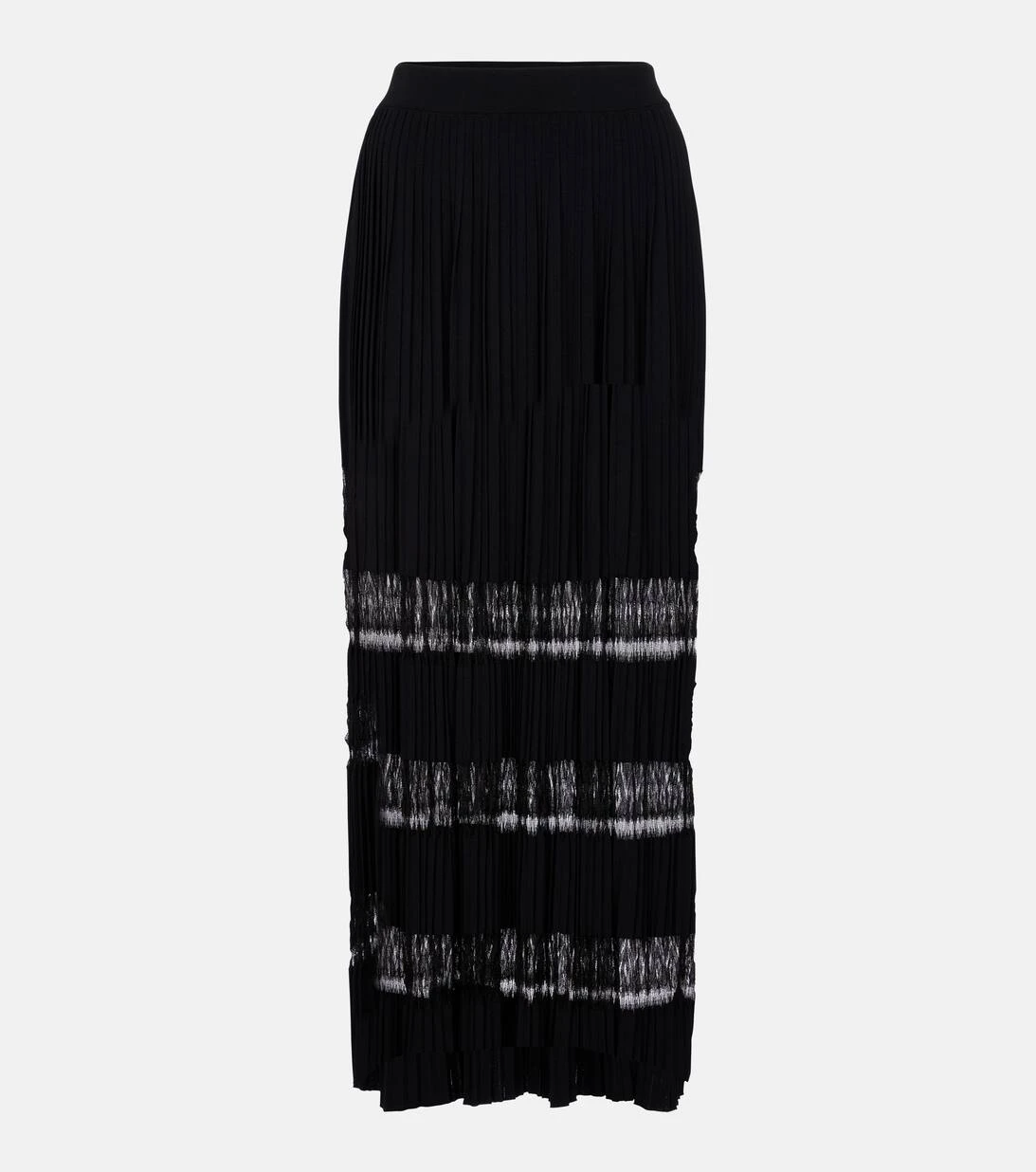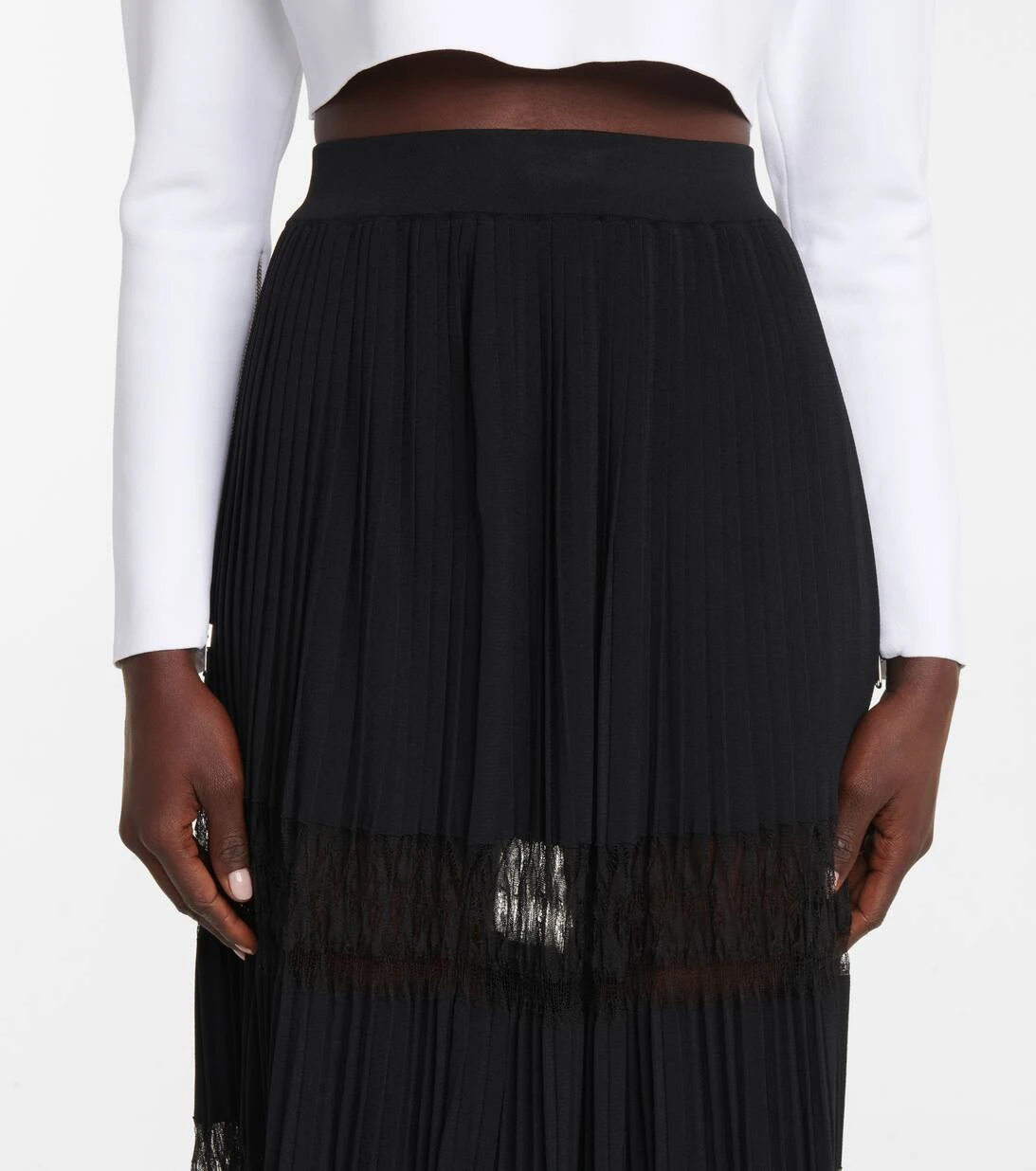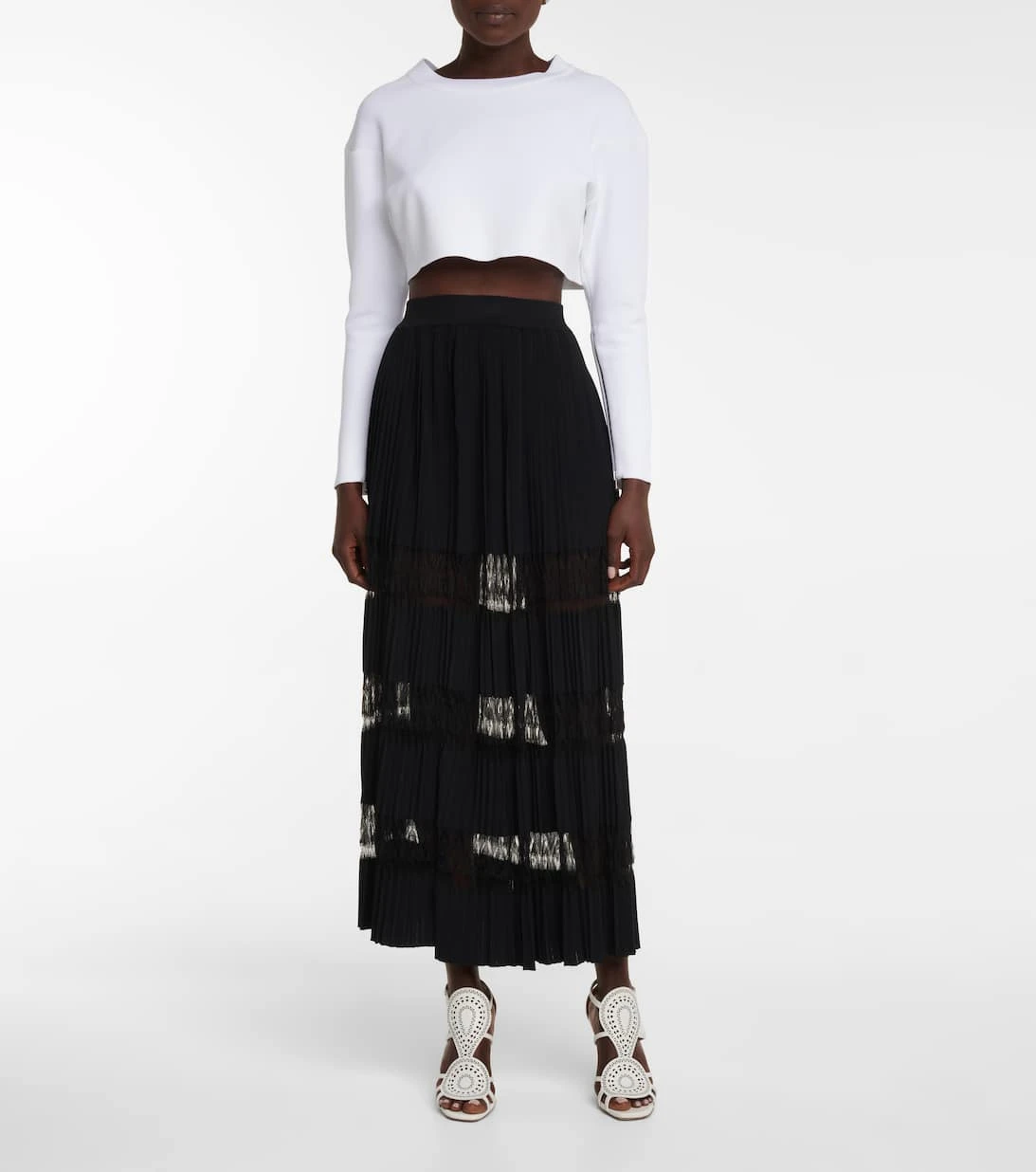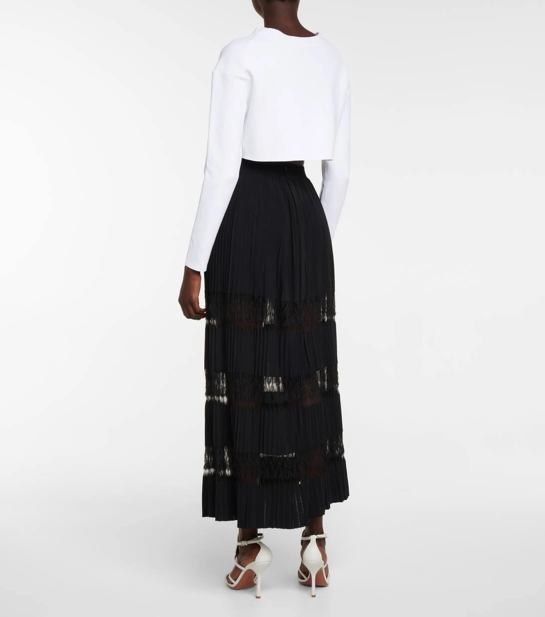 Semitransparente Einsätze aus Spitze verleihen diesem schwarzen Maxirock von Alaïa eine besonders sinnliche Note. Das High-Rise-Modell besteht dabei aus Strick mit einem Hauch von Seidenanteil.