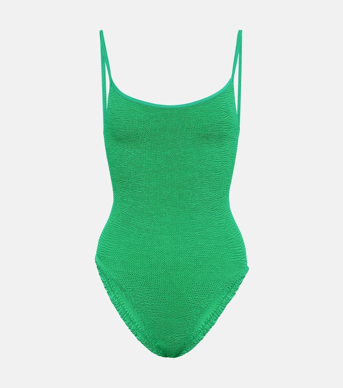 Der grüne Pamela Badeanzug von Hunza G ist wie geschaffen für Ihren nächsten tropischen Urlaub. Er wurde aus dem labeltypischen Seersucker gefertigt, das sich allen Körperformen anpasst, und verfügt über ein hochgeschnittenes Höschen mit minimaler Bedeckung.