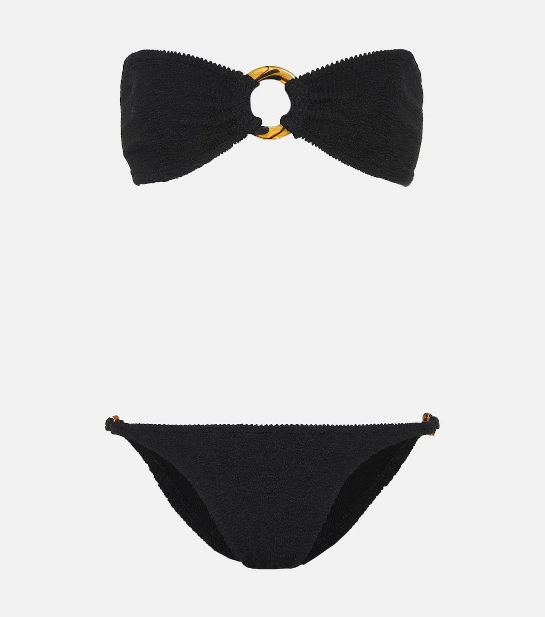 Hunza G zelebriert die weibliche Silhouette und begeistert mit Swimwear, die jedem Figurtyp schmeichelt. Der Gloria Bikini wurde in London per Hand aus elastischem Seersucker in Schwarz gefertigt und mit großen Ringen in Schildpattoptik verziert. Das One-Size-Modell setzt sich dabei aus einem Bandeau-Oberteil und einem Höschen mit extra hohem Beinausschnitt zusammen.