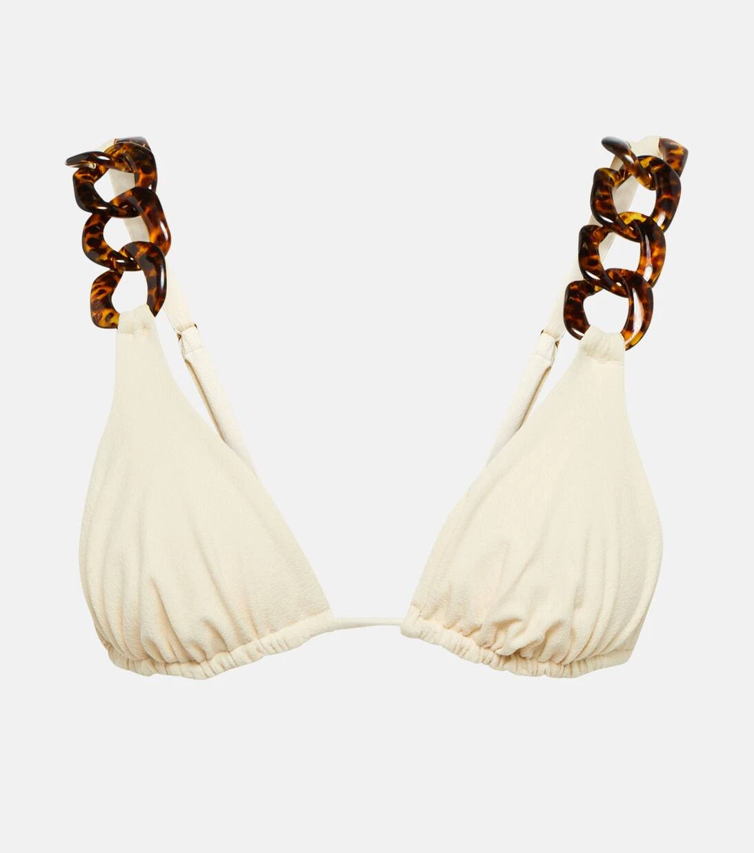 Das Tortoise Chain Bikini-Oberteil von Same Los Angeles beeindruckt durch markante Kettengliederverzierungen in Schildpatt-Optik an den verstellbaren Trägern. Der Style wurde aus cremefarbenem Velourslederimitat gefertigt.