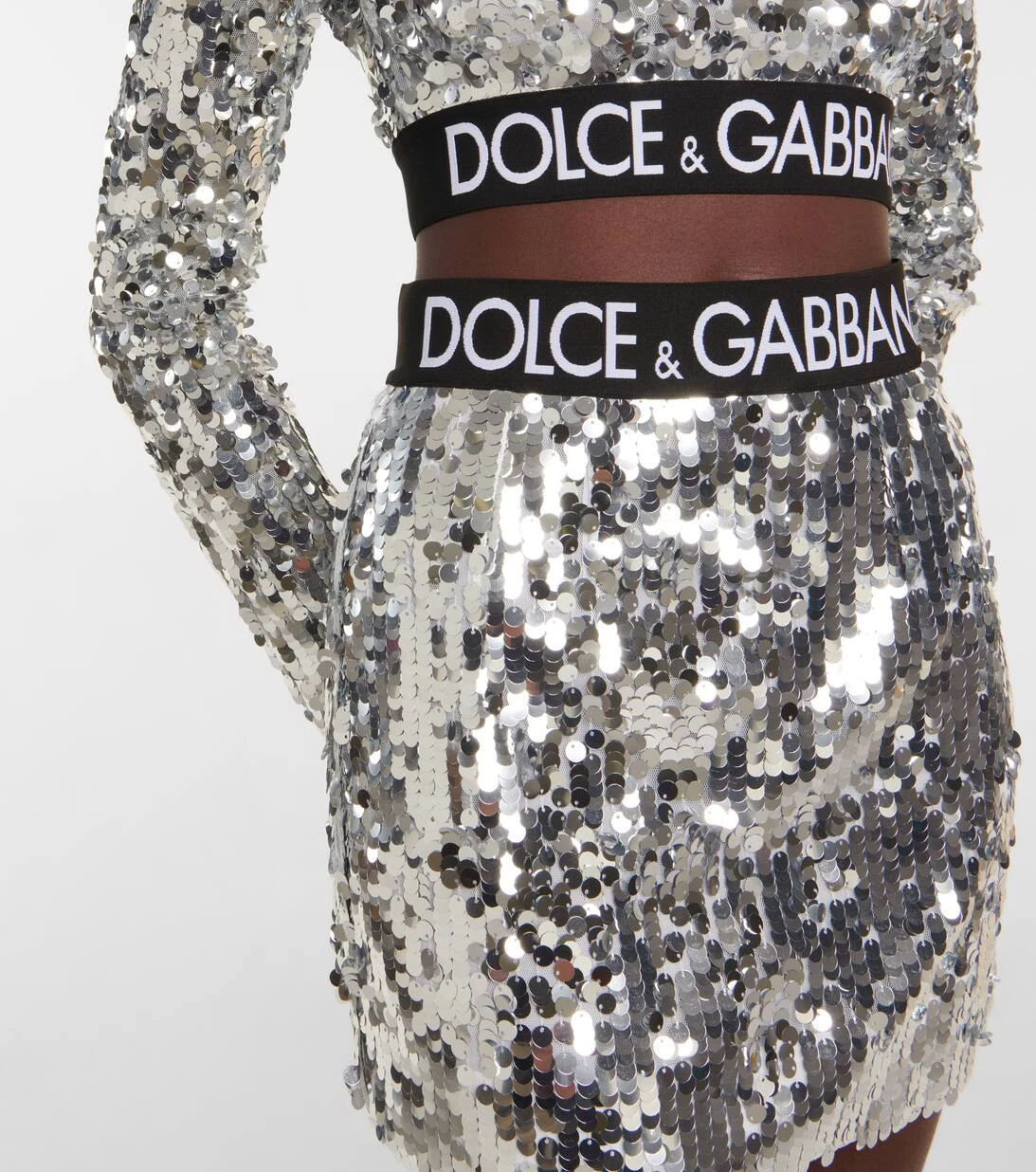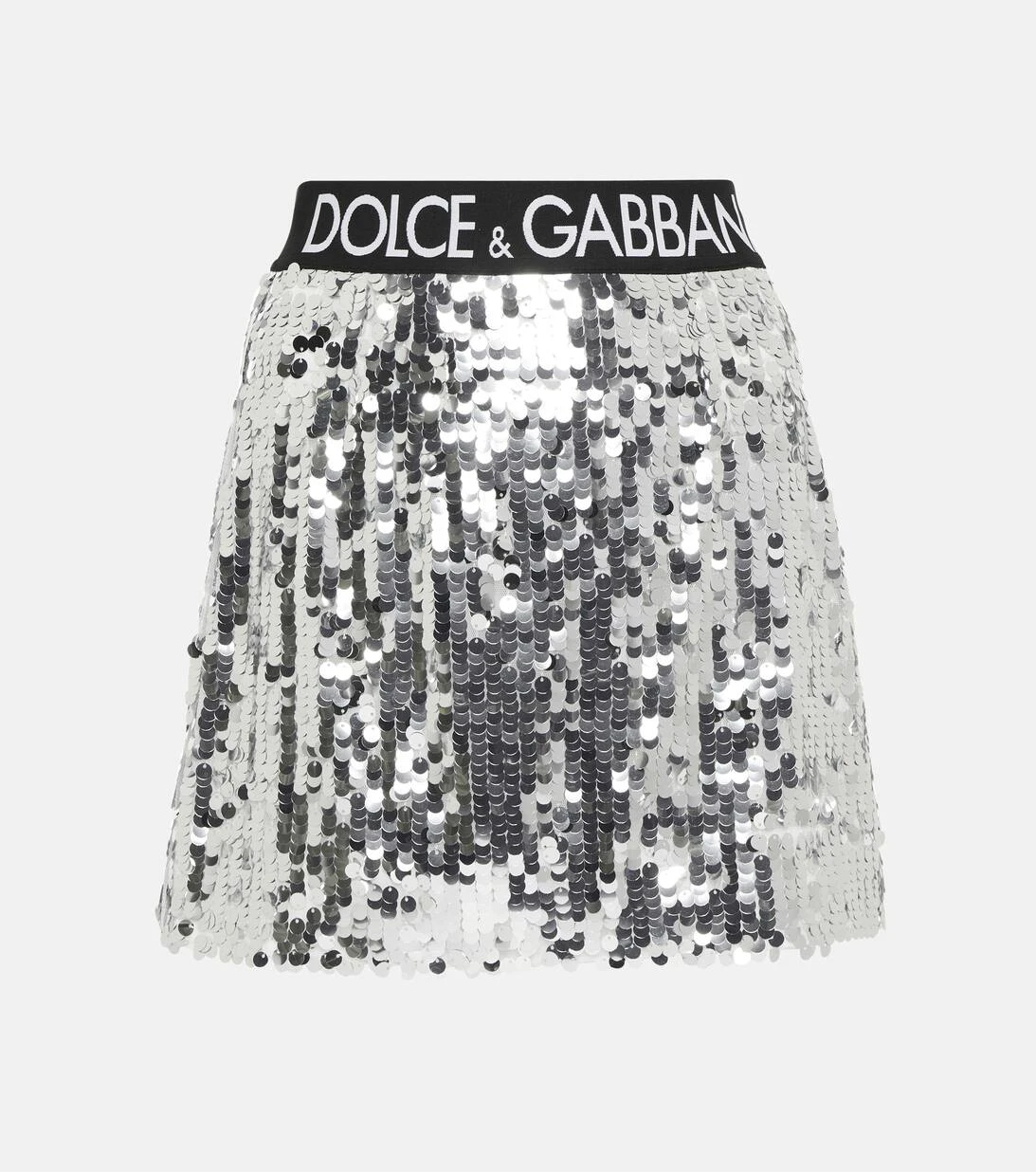 Lange Nächte verlangen nach aufregenden Looks, wie etwa diesem Minirock von Dolce&Gabbana. Das silberfarbene Modell in leichter A-Linie ist rundum mit schimmernden Pailletten bestickt und besitzt einen hochsitzenden Logo-Bund.