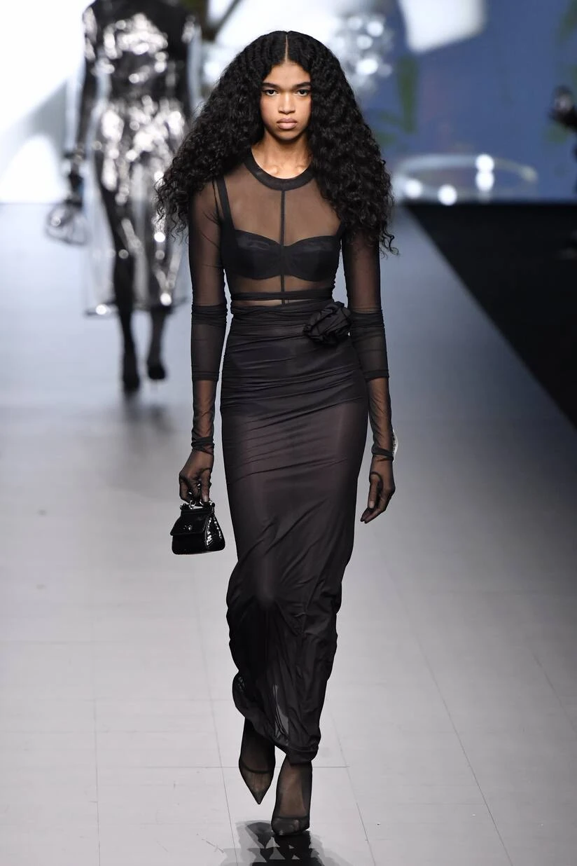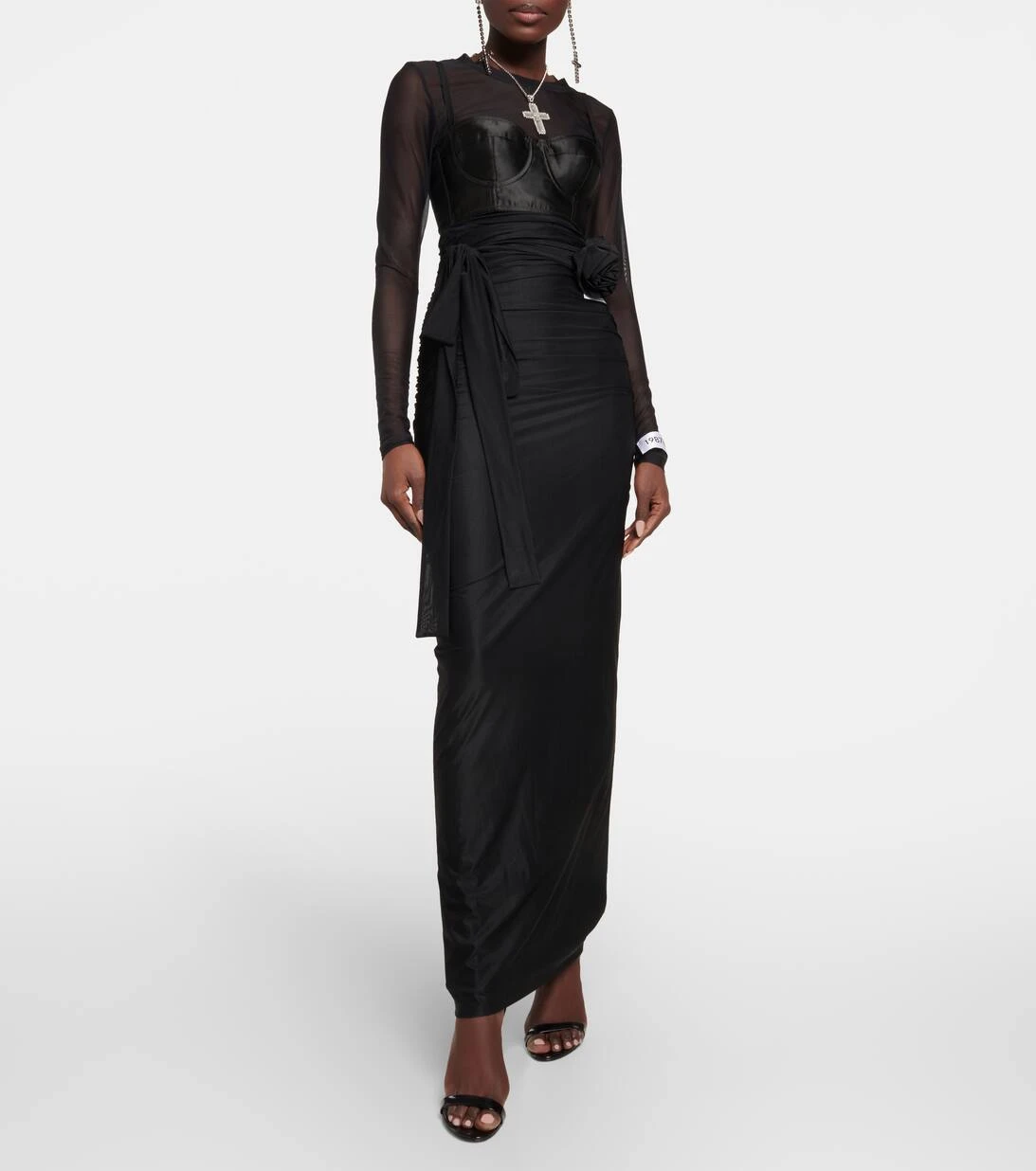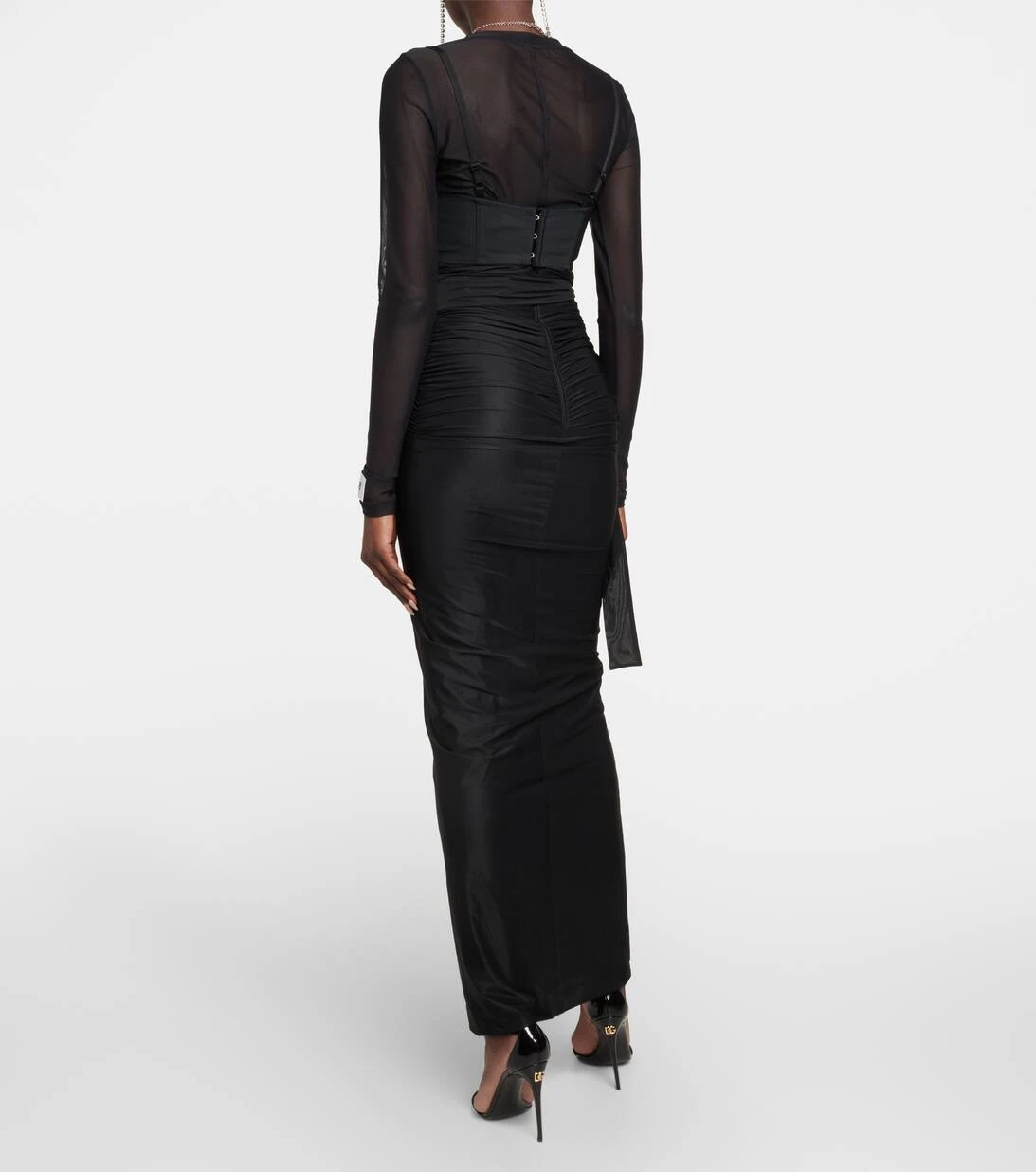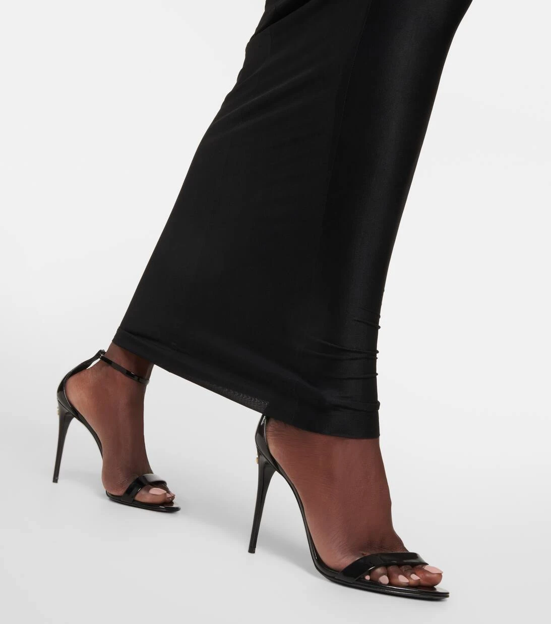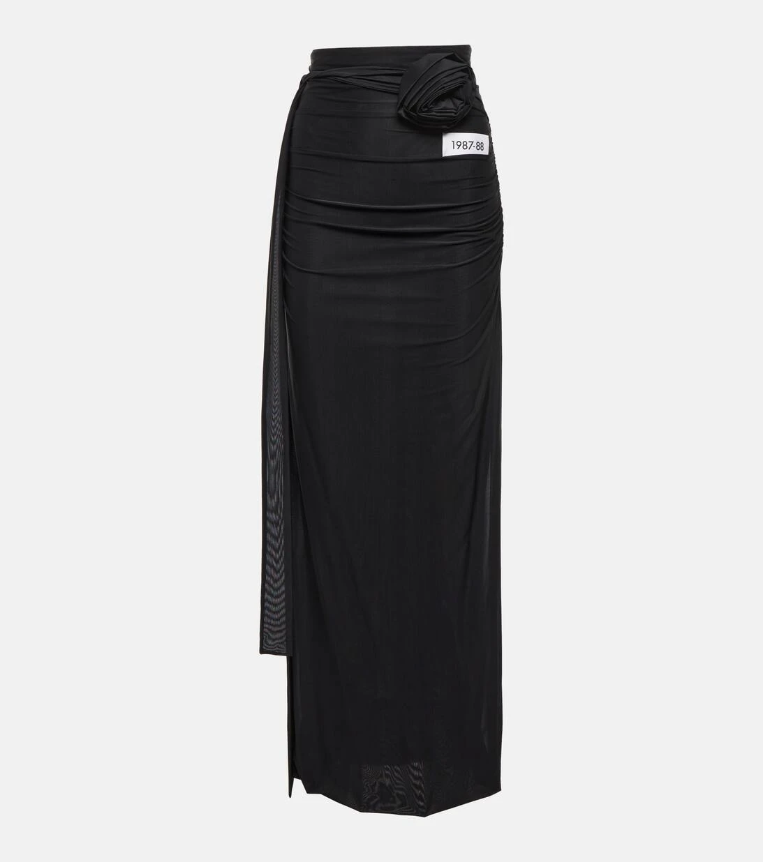 Die Kollaboration von Dolce&Gabbana mit Kim Kardashian hat eine sinnliche Neuinterpretation begehrter Silhouetten hervorgebracht. Dieser figurbetonte, elastische Maxirock verfügt über eine geraffte Konstruktion, einen „Re-Edition“-Aufnäher und einen mit Rosen verzierten Gürtel.