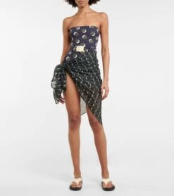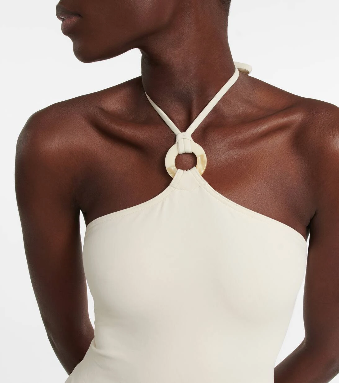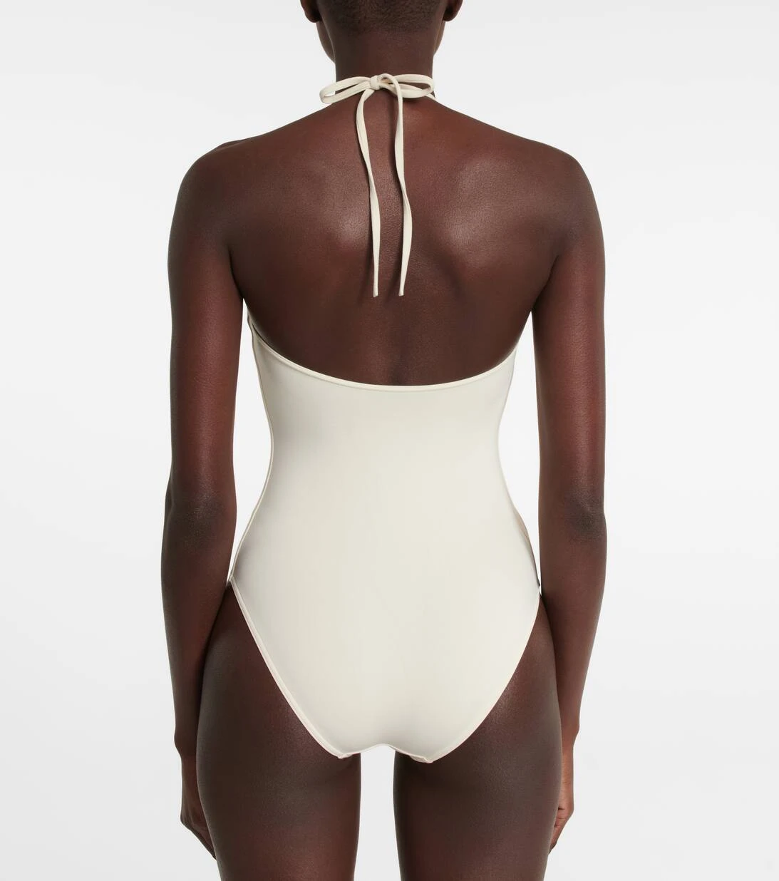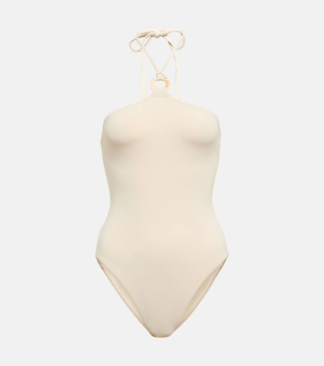 Die Swimwear von Eres besteht aus dem charakteristischen elastischen „Peau Douce“, das eine perfekte Passform garantiert. Der Céleste Badeanzug verfügt über einen Neckholder-Träger zum Binden, der mit einem perlmuttfarbenen Ring verziert ist.