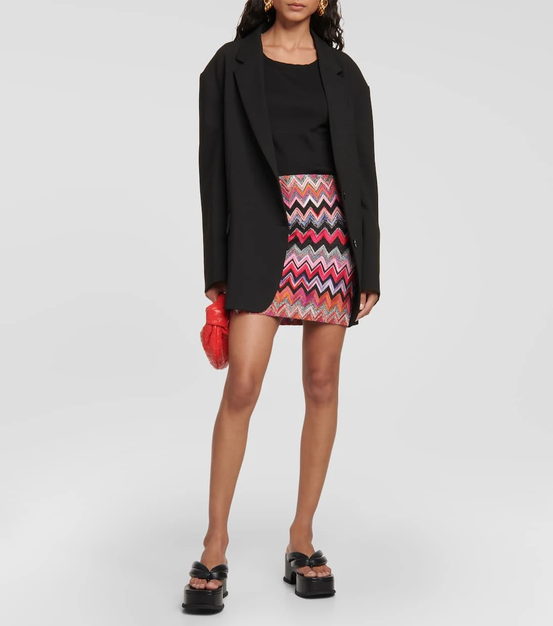 Die legendäre Zickzack-Stricktechnik von Missoni wurde erstmals in den 50er Jahren eingeführt und ist heute ein Symbol für italienischen Luxus. Dieser geradlinige Minirock zeigt sich mit einer hohen Taille und einem verdeckten Reißverschluss.