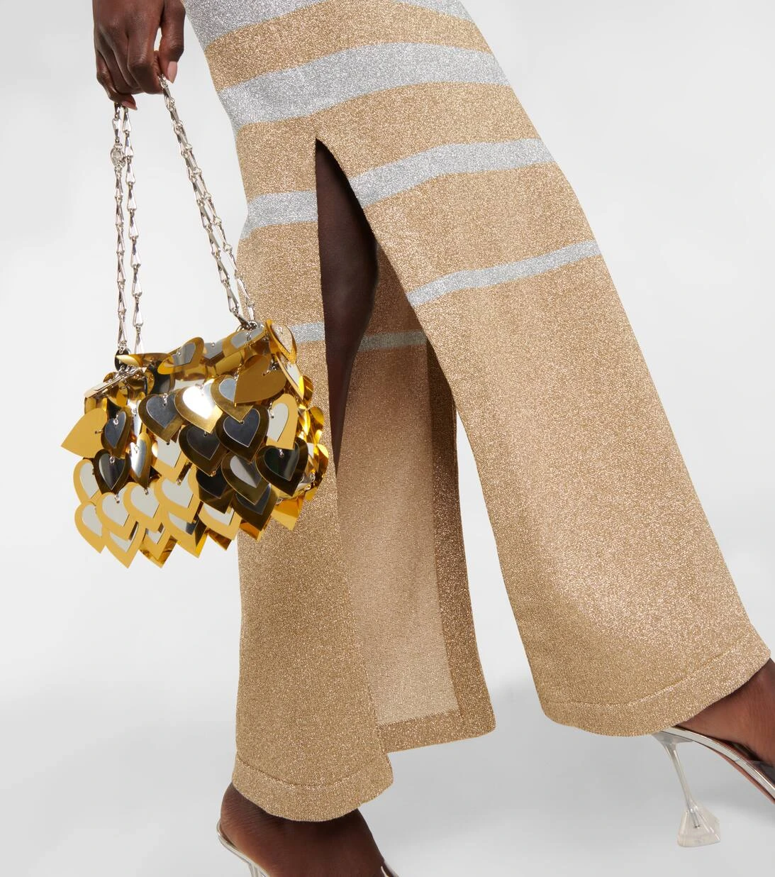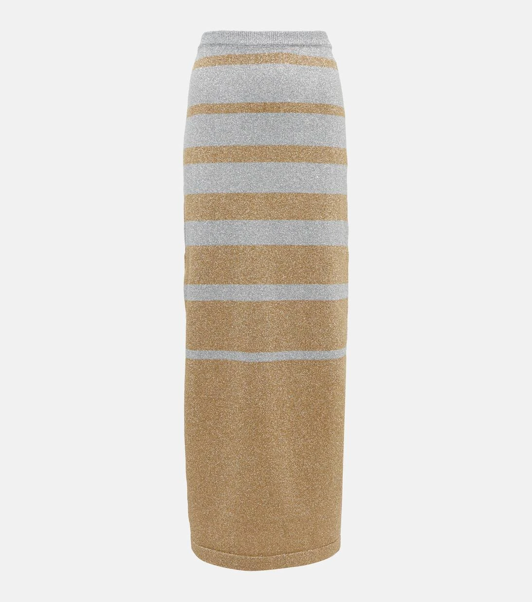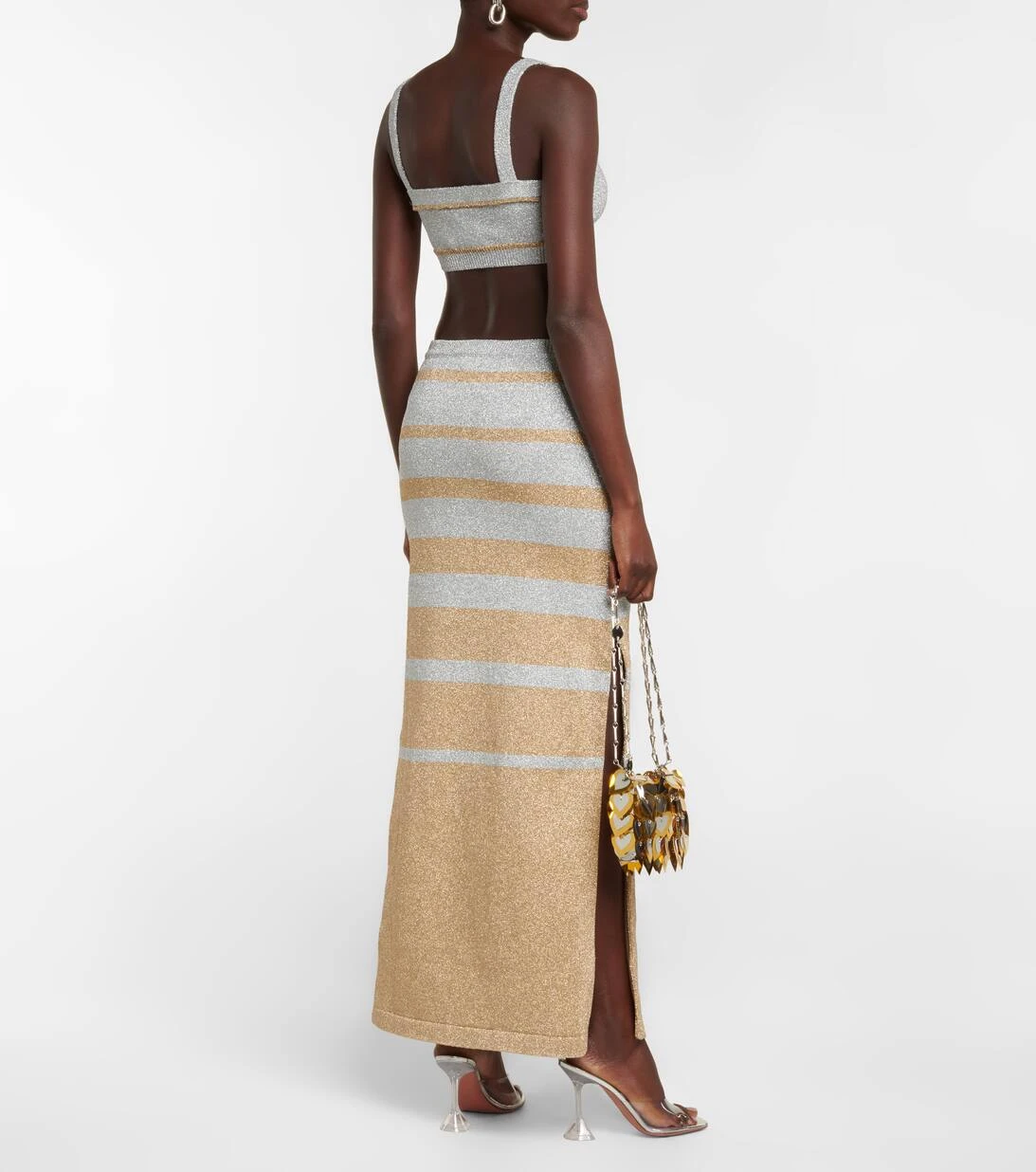 Dieser Rock von Paco Rabanne wurde aus leichtem Strick mit feinen Metallic-Garnen gefertigt, um ein schimmerndes Finish zu erzielen. Das Modell verfügt über gerippte Abschlüsse und ein Streifenmotiv in Silber und Gold.