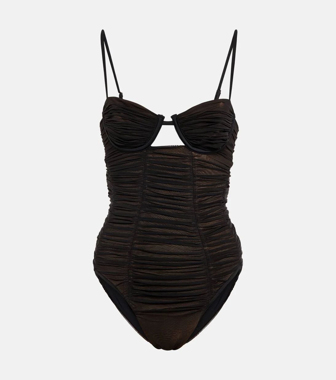Die Swimwear Styles von Self-Portrait vereinen Funktionalität mit modernen Designelementen. Dieser Badeanzug aus Mesh präsentiert sich im glamourösen Lingerie-Design mit Bügel-Cups für eine stützende Silhouette, beidseitigen Cut-outs und durchgehend gerafften Details.