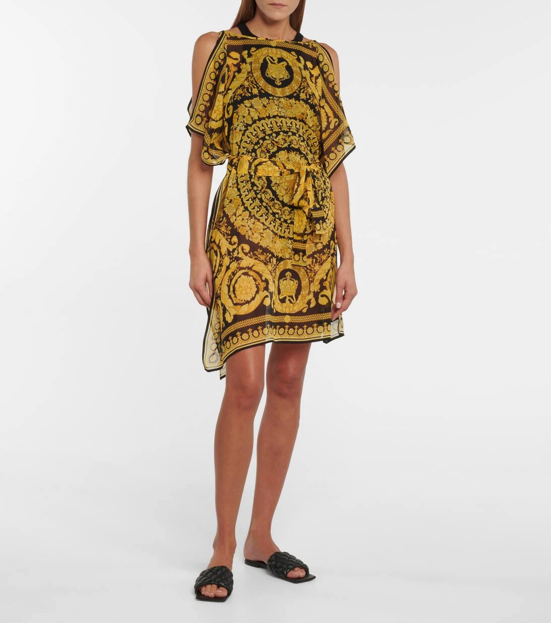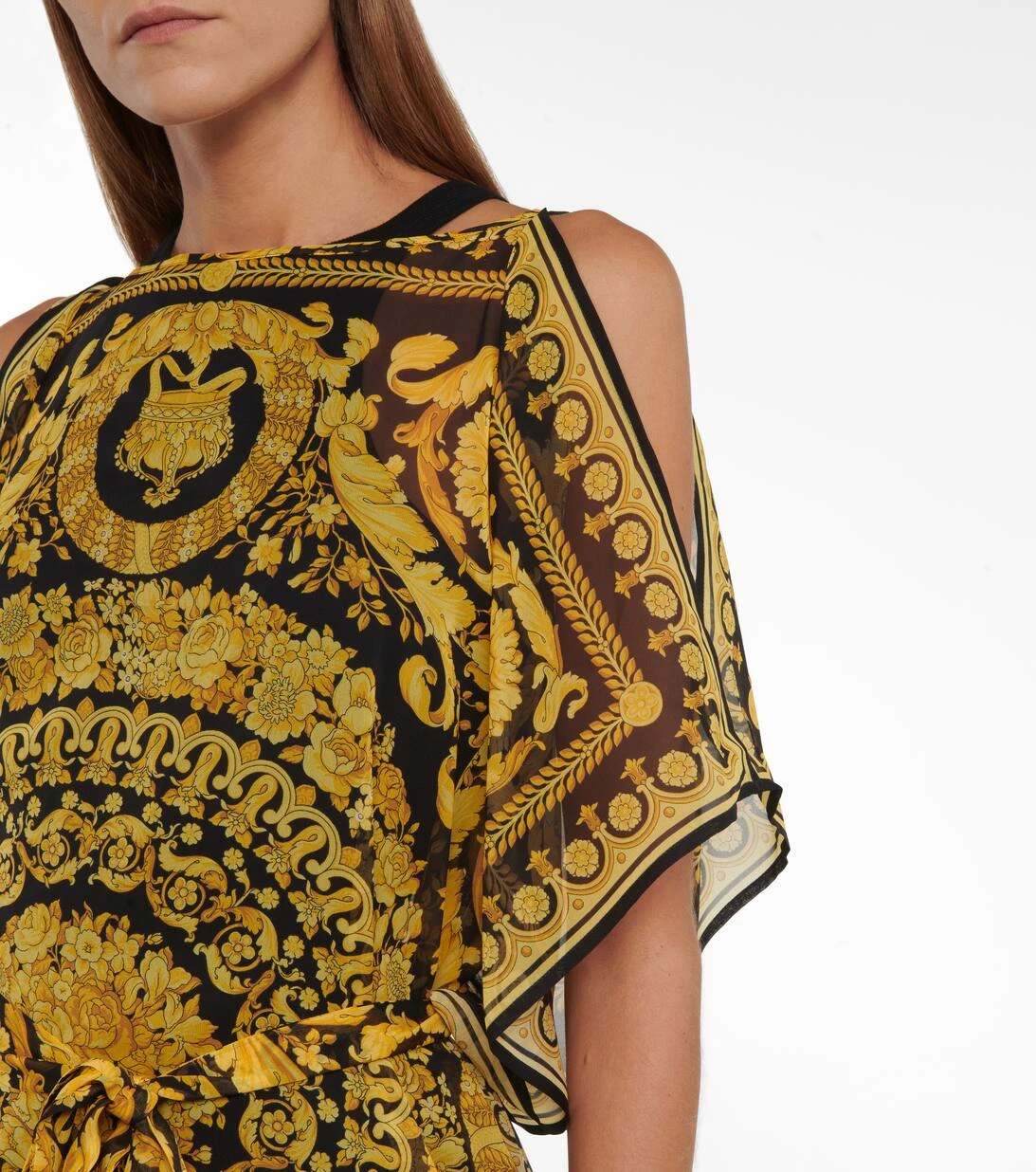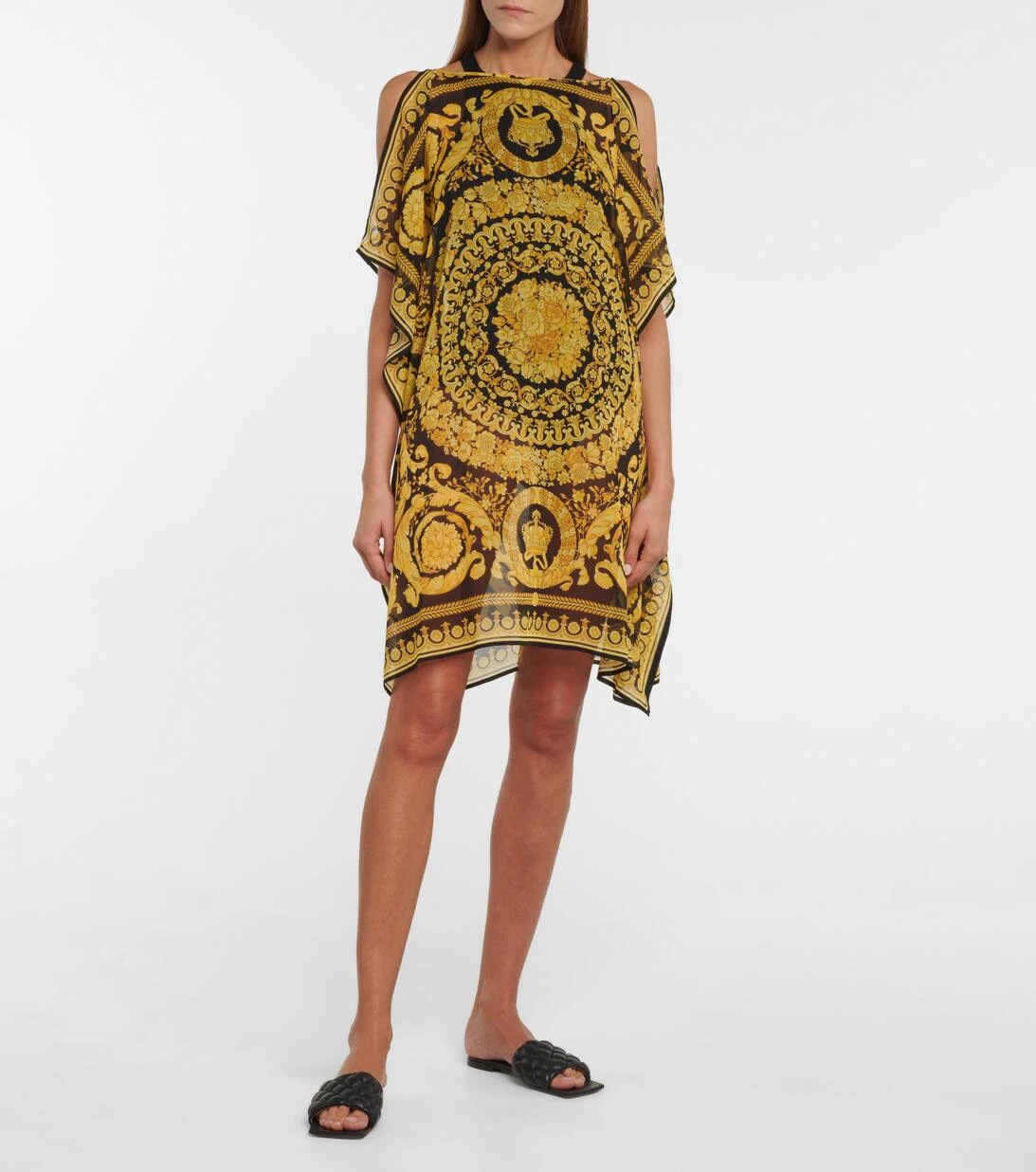 Dieser gold-schwarze Kaftan von Versace ist mit dem kultigen Barocco-Print des Labels bedruckt. Er wurde aus Seide gefertigt und verfügt über einen U-Boot-Ausschnitt sowie einen Bund zum Selbstbinden.