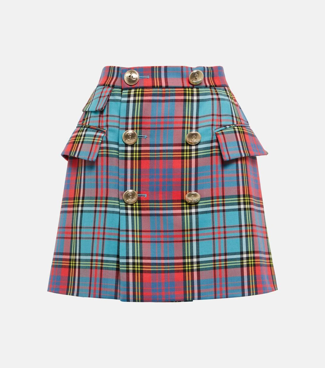 Dieser Minirock von Vivienne Westwood wurde aus reiner Wolle mit leicht ausgestellter Silhouette gefertigt. Das Design sitzt hoch in der Taille und erhält durch das bunte Karomuster, die goldfarbenen Knöpfe und die Pattentaschen eine markentypische Note.