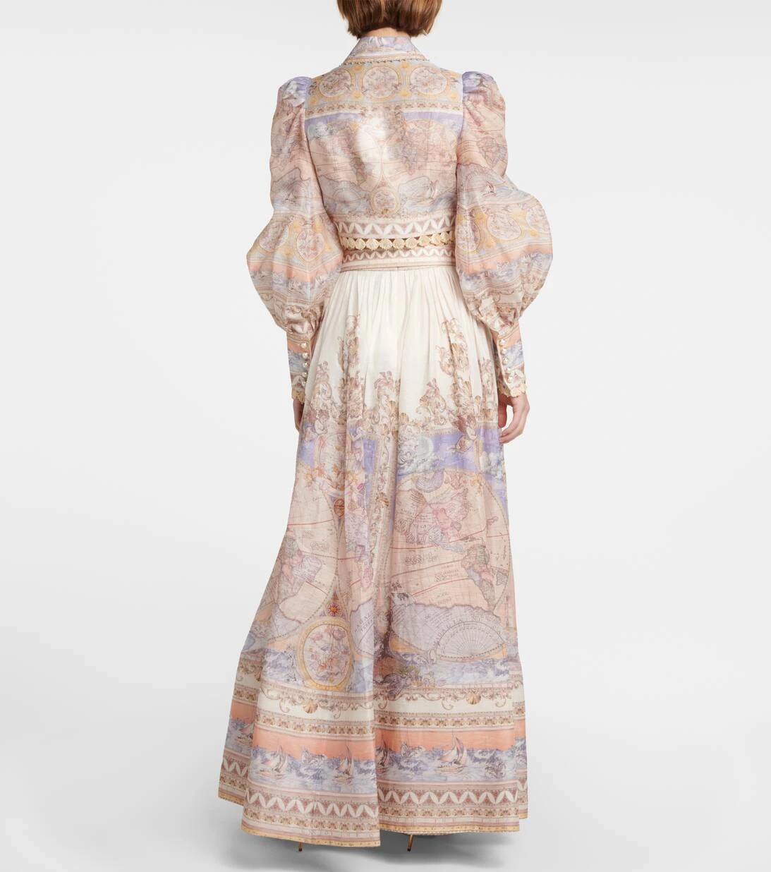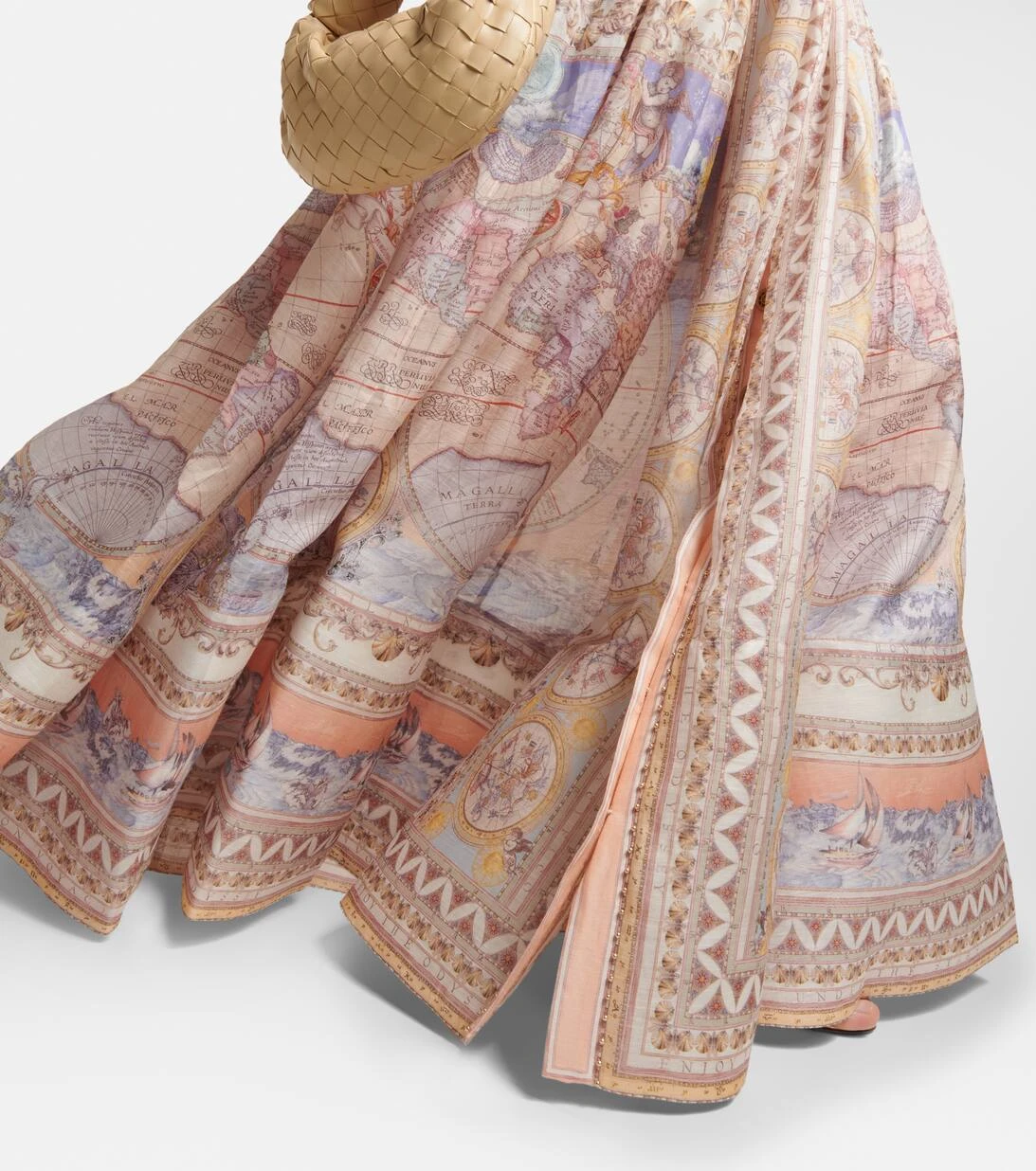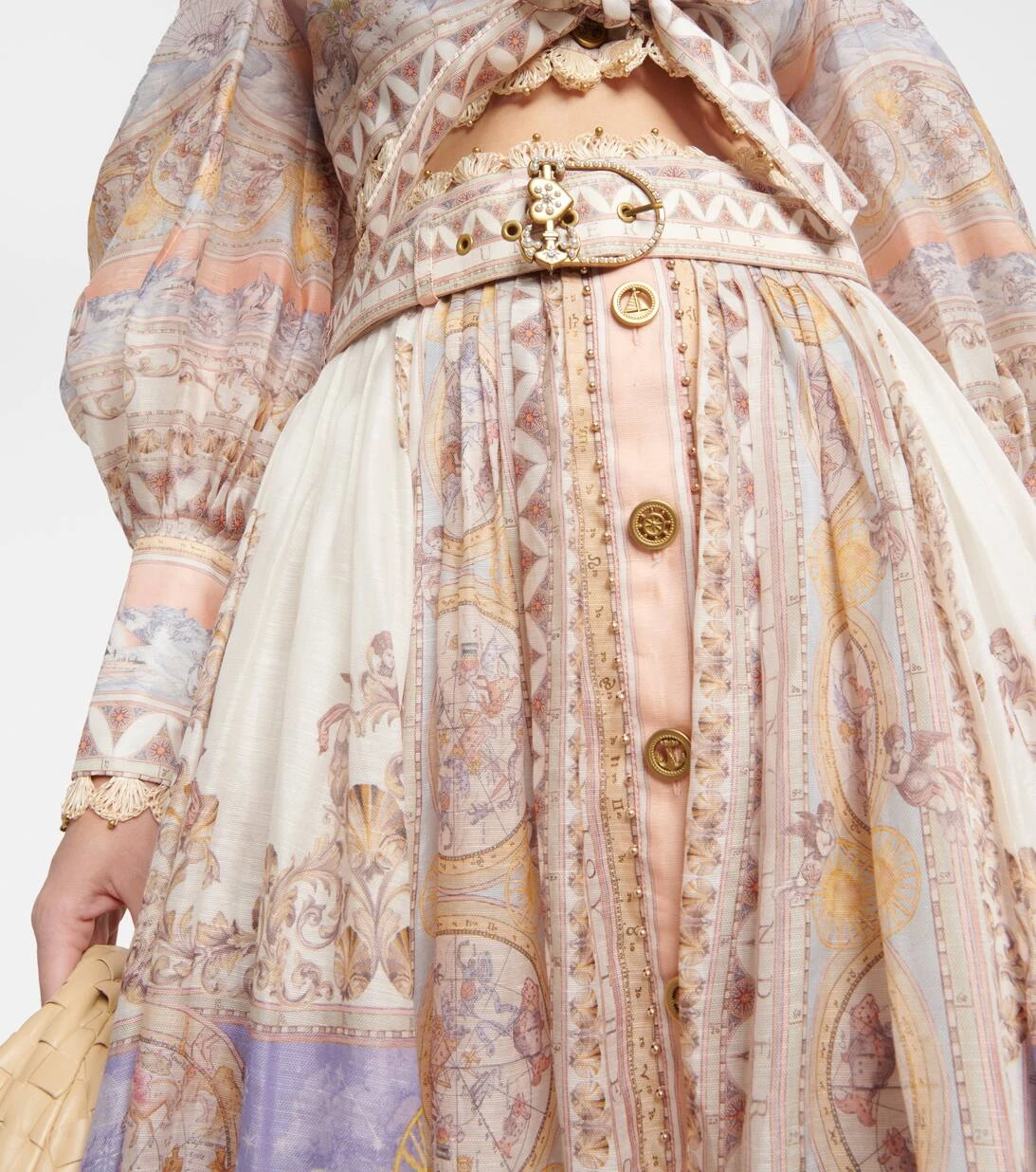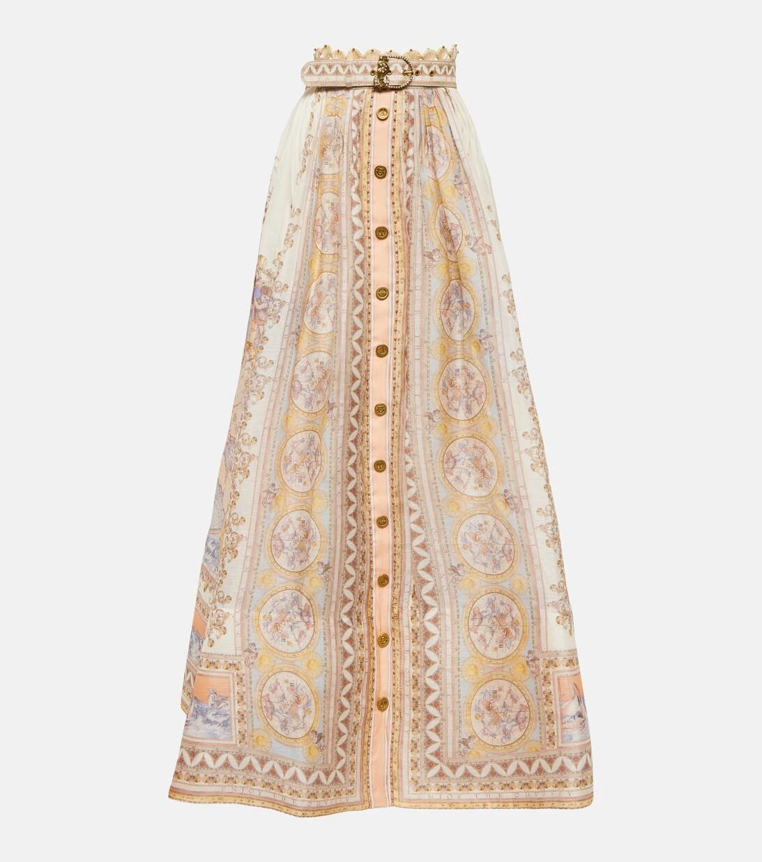 Der High Tide Rock aus der Resort 2023 Kollektion verkörpert den verspielten, femininen Ansatz von Zimmermann. Das aus Seide und Leinen gefertigte High-Rise-Modell mit Gürtel und Odyssey-Print verfügt über Perlenbesätze und Knöpfe im nautischen Stil auf der Vorderseite.